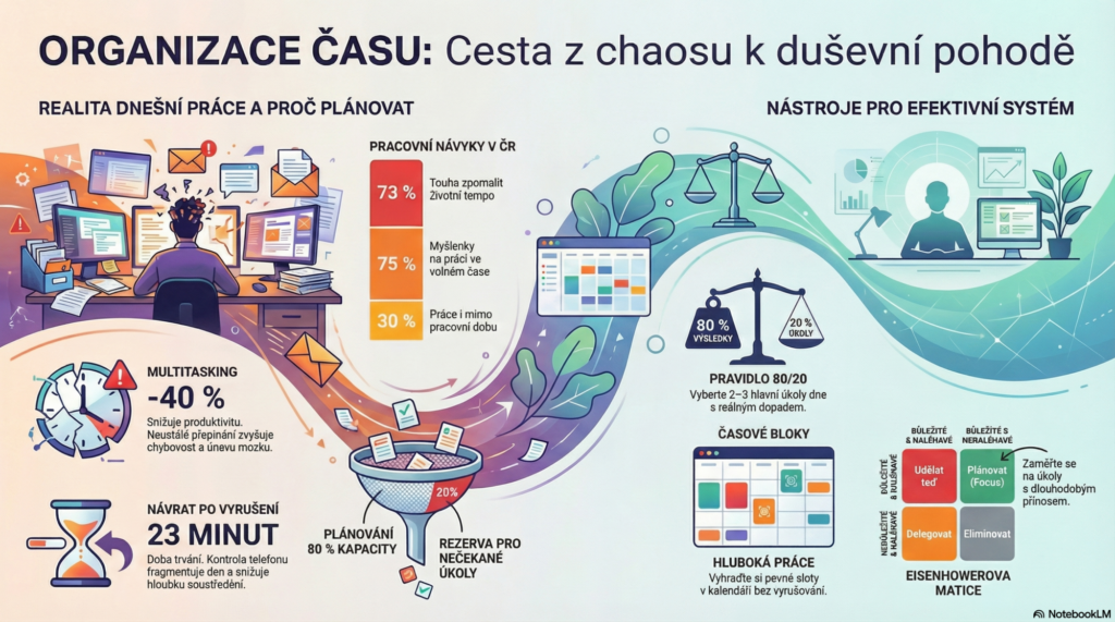 Organizace času dnes není jen téma pro lidi, kteří chtějí být výkonnější. Je to reakce na realitu, ve které je práce roztahaná do celého dne a hlava často nevypíná ani ve volnu. Podle výzkumu Ipsos si 73 % lidí přeje zpomalit tempo svého života a česká data ukazují, že 30 % lidí pracuje i mimo pracovní dobu, zatímco tři čtvrtiny lidí myslí ve volném čase na práci.